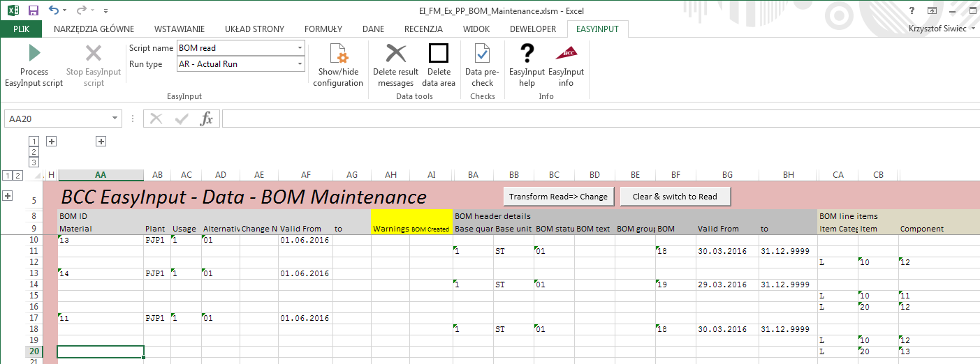 When the script is ready, you can start using it, in many cases, increasing work efficiency compared to standard tools multiple times. Data migration, especially if incorrect records must be removed from data, is much better organized in SNP EasyInput than in LSMW, for example. Mass changes of the master data activated via a single key pressed instead of their tedious processing through the SAP GUI can bring tangible benefits in terms of both time and accuracy of data (in MS Excel, data can be easily changed collectively using Excel functions). Mass processing of transactional data previously prepared in an MS Excel workbook is often easier than entering these data manually via the SAP GUI.