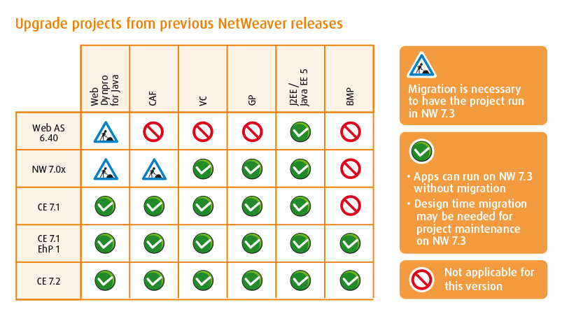 In the case of Web Dynpro Java, we can enjoy the backward compatibility of source code (as opposed to binary compatibility). This means, more or less, that the WDJ project must be re-compiled and re-deployed to work properly. It is worth mentioning that you do not have to change the NWDI server to support the deployment of Portal 7.3. However, remember to set the required dependencies and select the correct SDK.