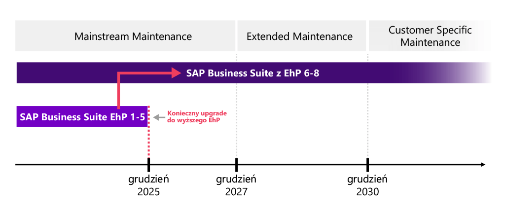 • 31 grudnia 2025 – data zakończenia Mainstream Maintenance dla Enhancement Package (EhP) wersji 1-5. Ci klienci nie mają możliwości wykupienia przedłużonego wsparcia (Extended Maintenance) dla swoich systemów. Aby otrzymać wsparcie SAP do głównych aplikacji SAP Business Suite 7, które nie posiadają wdrożonych żadnych EhP lub mają wdrożony EhP w wersji niższej niż 3 ostatnie, będzie konieczny upgrade do aktualnej wersji EhP. Jednakże takie rozwiązanie zadziała jedynie tymczasowo (szczegóły poniżej).