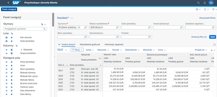 - drążenie danych, aby wyświetlić szczegółowe informacje dotyczące wybranych jednostek organizacyjnych, produktów, grup produktów, zleceniodawców, typów dokumentów sprzedaży itd.,