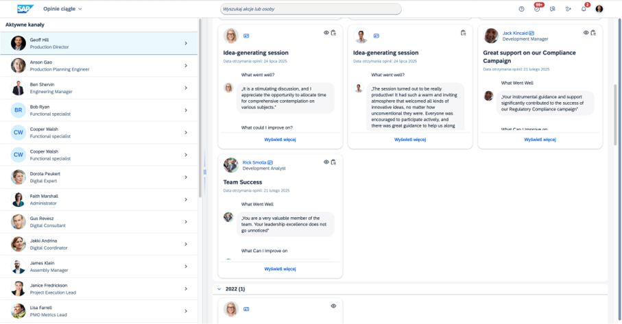 W pamięci pozostaje także pozytywna informacja od współpracowników. SuccessFactors wręcz buduje kulturę feedbacku. Jest to odpowiedź na naszą potrzebę bycia docenionym, ale też wzmocnienie tych działań, które są ważne dla organizacji i warto je powtarzać. Szczerze odpowiedzmy sobie na pytanie, jak często wyrażamy uznanie innym pracownikom, szczególnie teraz, gdy budowanie relacji w firmie ze względu na hybrydowy model pracy jest utrudnione.