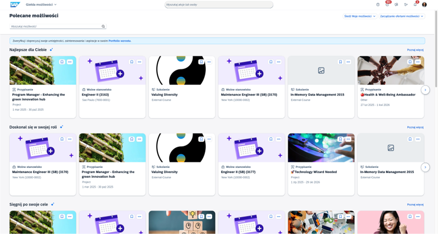 Paradoks polega na tym, że jeśli dajemy pracownikom zbyt wiele nieustrukturyzowanych szkoleń, spada skuteczność rozwoju. Dostęp do setek materiałów szkoleniowych nie jest strategią rozwojową. Jest iluzją rozwoju. Im więcej opcji, tym mniejsze realne zaangażowanie. Opportunity Marketplace w SuccessFactors porządkuje ten chaos.